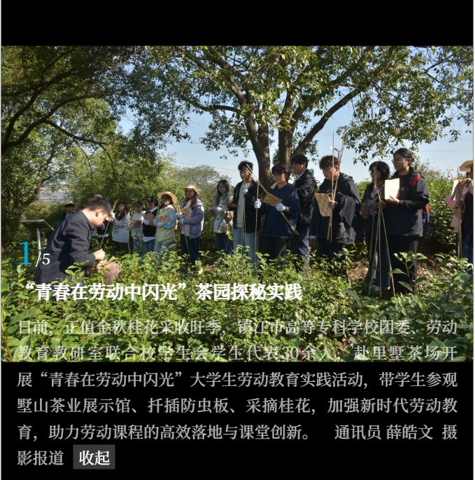 今日镇江|“青春在劳动中闪光”茶园探秘实践 信息来源:团委发布时间:25.10.31阅读次数:131 媒体链接:今日镇江:https://h5.jrzjapp.cn/davmu/mobile.html?url=https://h5.jrzjapp.cn/davmu/share/holly/gallery/2025/10/Rmm9YCmWv/index.html