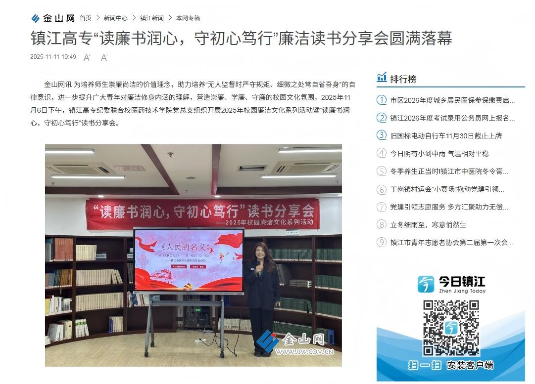 金山网|镇江高专“读廉书润心,守初心笃行”廉洁读书分享会圆满落幕 信息来源:医药技术学院发布时间:25.11.11阅读次数:247 媒体链接:金山网:https://www.jsw.com.cn/2025/1111/1931052.shtml
