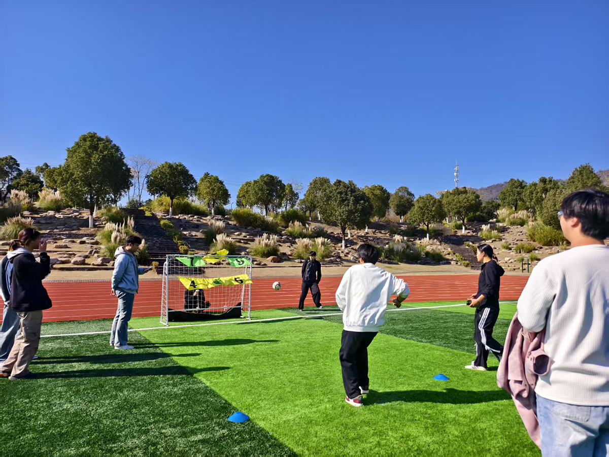 本次趣味运动会摒弃了足球比赛的高强度竞技模式,设置了趣味射门、足球绕桩接力、盲人摸球寻点等特色项目,兼顾趣味性与参与性,让学生走出宿舍、走向操场,在轻松的氛围中感受足球魅力。在趣味射门项目区,选手们瞄准不同分值的射门区域,凝神聚力踢出每一脚,进球时的欢呼声此起彼伏;足球绕桩接力赛中,队员们脚内侧稳稳带球,灵活绕过标志桶,完成接力后与队友击掌鼓劲,展现出良好的配合默契;盲人摸球寻点项目充满挑战性,蒙眼队员在队友的精准指挥下,小心翼翼寻找足球,并送至指定点位,大家不时地为团队的默契配合而鼓掌,欢声笑语不断。