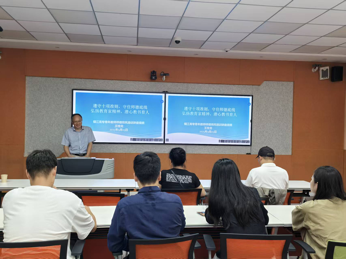 为加强新时代教师队伍建设,引导新教师牢固树立立德树人根本任务,弘扬教育家精神,9月25日下午,学校在智慧教室102举办新入职教师师德师风学习报告会。校原党委副书记、校教学督导委员会主任王桂龙教授应邀作了“遵守十项准则,守住师德底线;弘扬教育家精神,潜心教书育人”主题报告。新入职教师参加了报告会。 讲座伊始,王桂龙教授从国家政策层面出发,系统梳理了近年来国家关于师德师风建设的重要文件,包括《新