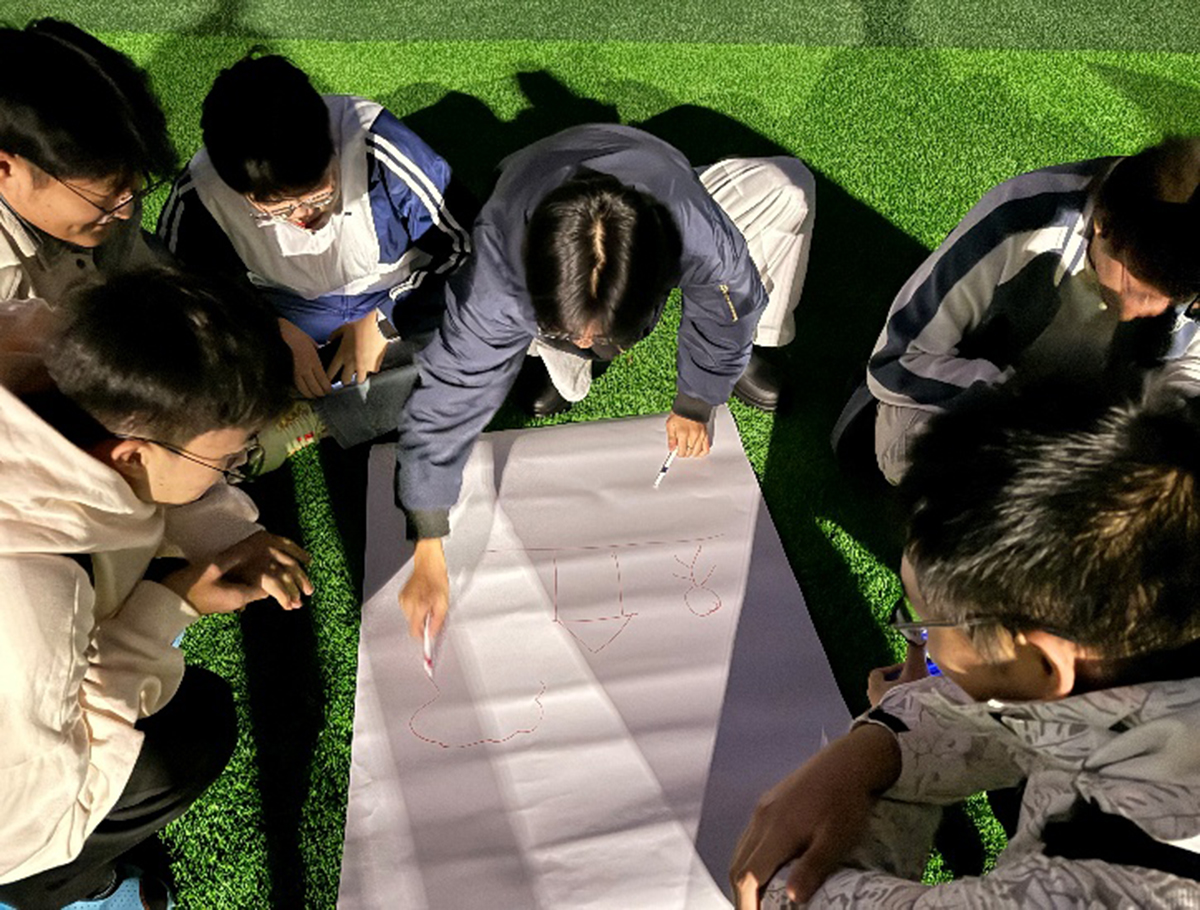 夜幕下的操场上,同学们或围聚在一起专注设计团队标识,或齐心协力绘制创意海报,或自信展示团队成果,每一张笑脸、每一次协作都彰显着新生们的活力与担当。希望同学们在沐光同行的路上,坚定成长的方向,为大学生活奏响团结奋进的序曲。