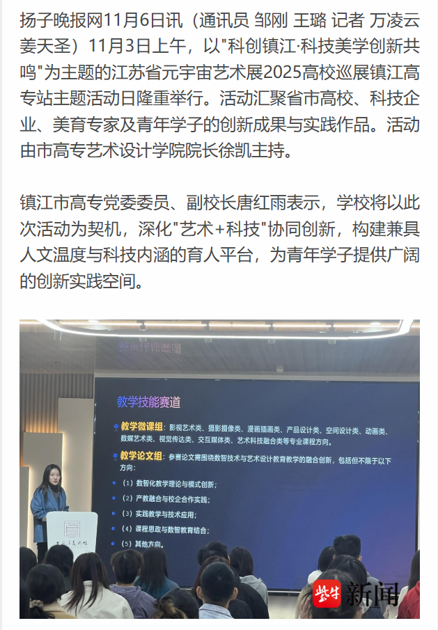 紫牛新闻|科创镇江・艺科共鸣!江苏省元宇宙艺术展 2025 高校巡展镇江高专站启幕 信息来源:宣传部发布时间:25.11.10阅读次数:638 媒体链接:紫牛新闻:https://wap.yzwb.net/wap/news/4840132.html