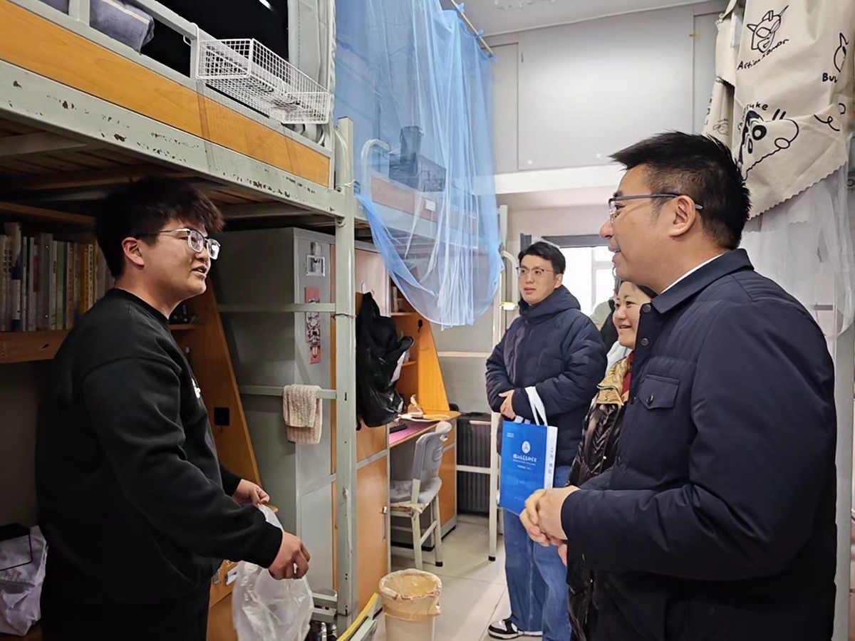学院党总支书记彭涛带队深入学生宿舍走访过程中,彭涛与同学们亲切交谈,详细询问大家的期末考试情况、假期见习实践收获、返校适应状态以及新学期的学习规划。他鼓励同学们尽快收心归位,调整作息节奏,科学规划学业与生活,养成良好的学习、作息和卫生习惯,以崭新姿态迎接新学期。