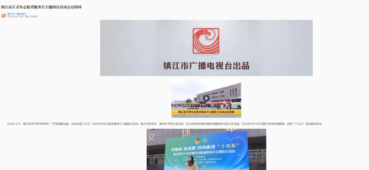 镇江广播|镇江高专青年志愿服务月主题团日活动点亮校园 信息来源:团委发布时间:26.03.09阅读次数:472 媒体链接:镇江广播:https://m.17zhenjiang.cn/h5appzj/a/2603/a517bc252e1e49b88deacea65378f77d.html?isshare=1
