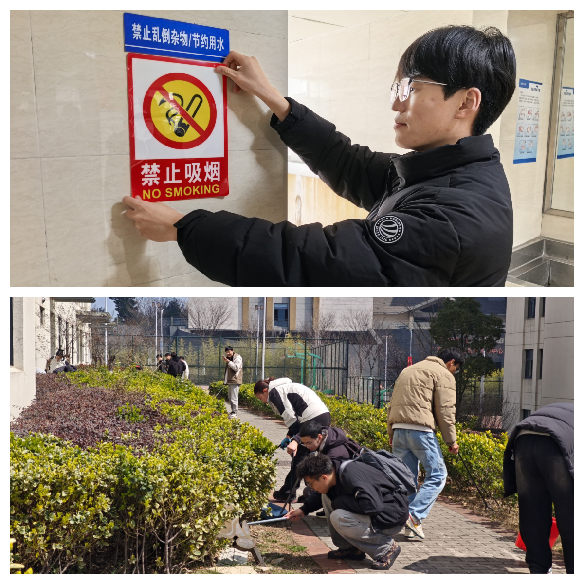 由宿管工作人员和学生组成的志愿队分五组深入18号宿舍楼及周边区域,通过地毯式排查清理宿舍楼下花园、楼道、消防通道等区域烟头及垃圾,并在宿舍入口、卫生间等公共活动区等10处重点区域张贴“禁止吸烟”警示标识,形成“视觉警示+行为引导”的双重举措。