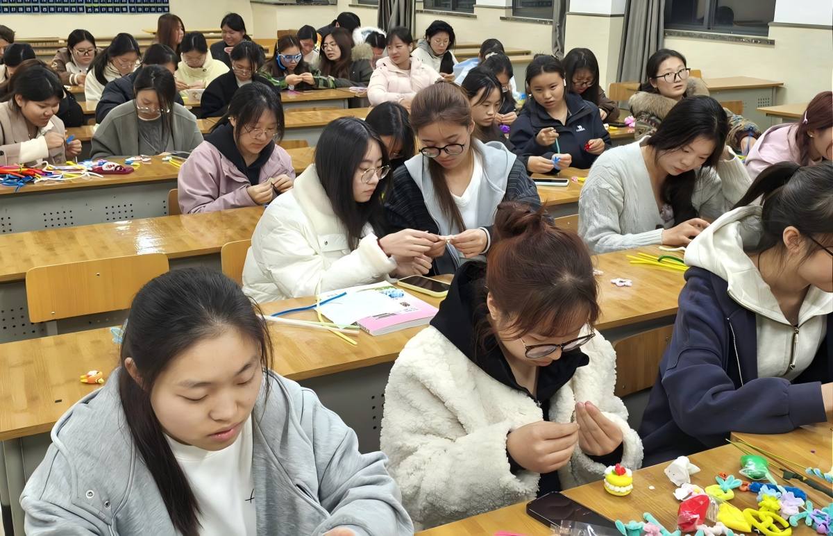 活动现场暖意融融,同学们踊跃参与、潜心创作,扭扭棒、粘土等普通材料在指尖焕发生机。大家结合自身专业特长,紧扣“感恩”“回馈”“希望”三大主题,精心制作幼儿教具、卡通玩偶等作品,每一件手作都构思精巧、饱含深情,既展现了丹师学子扎实的专业素养,更承载着他们对国家资助政策的深切感激,以及对未来投身教育事业、传递温暖的美好憧憬。