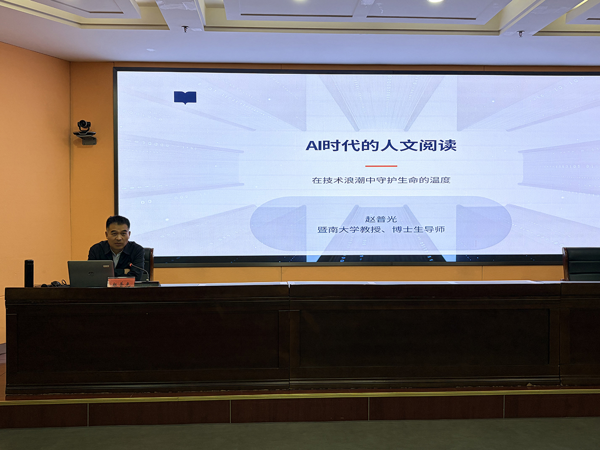 4月22日下午,在第三十一个“世界读书日”和全国首个“全民阅读活动周”到来之际,暨南大学文学院教授、博士生导师赵普光应邀走进正则讲坛,在会议中心一楼报告厅作“AI时代的人文阅读”主题讲座。我校百余名师生到场聆听。