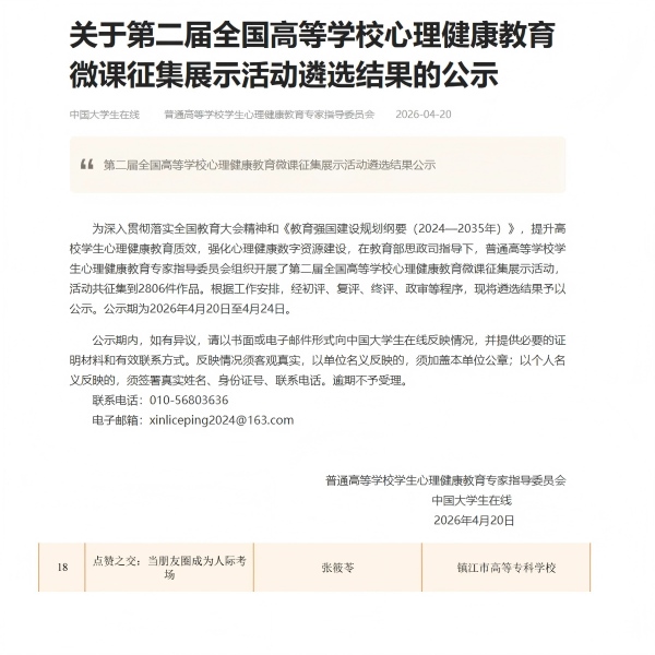 近日,由教育部思政司指导、普通高等学校学生心理健康教育专家指导委员会主办的全国心理健康教育微课征集展示活动结果揭晓。本次活动共征集到来自全国高校的微课作品2806件,经过初评、复评、终评及政审等层层严格遴选,最终评定优秀教师作品160件、学生作品80件。我校卫生护理学院商玉婷老师指导、学生张筱苓创作的微课作品成功入选学生类优秀作品,为学校心理健康教育工作再添荣誉。