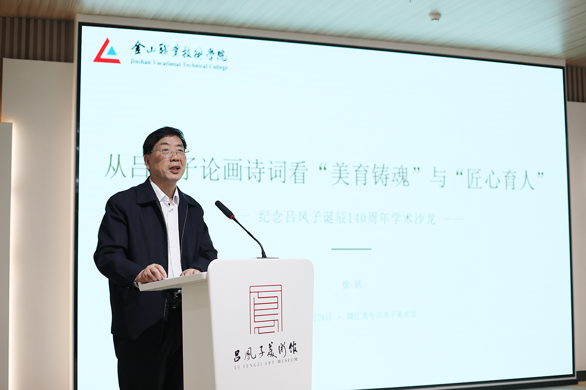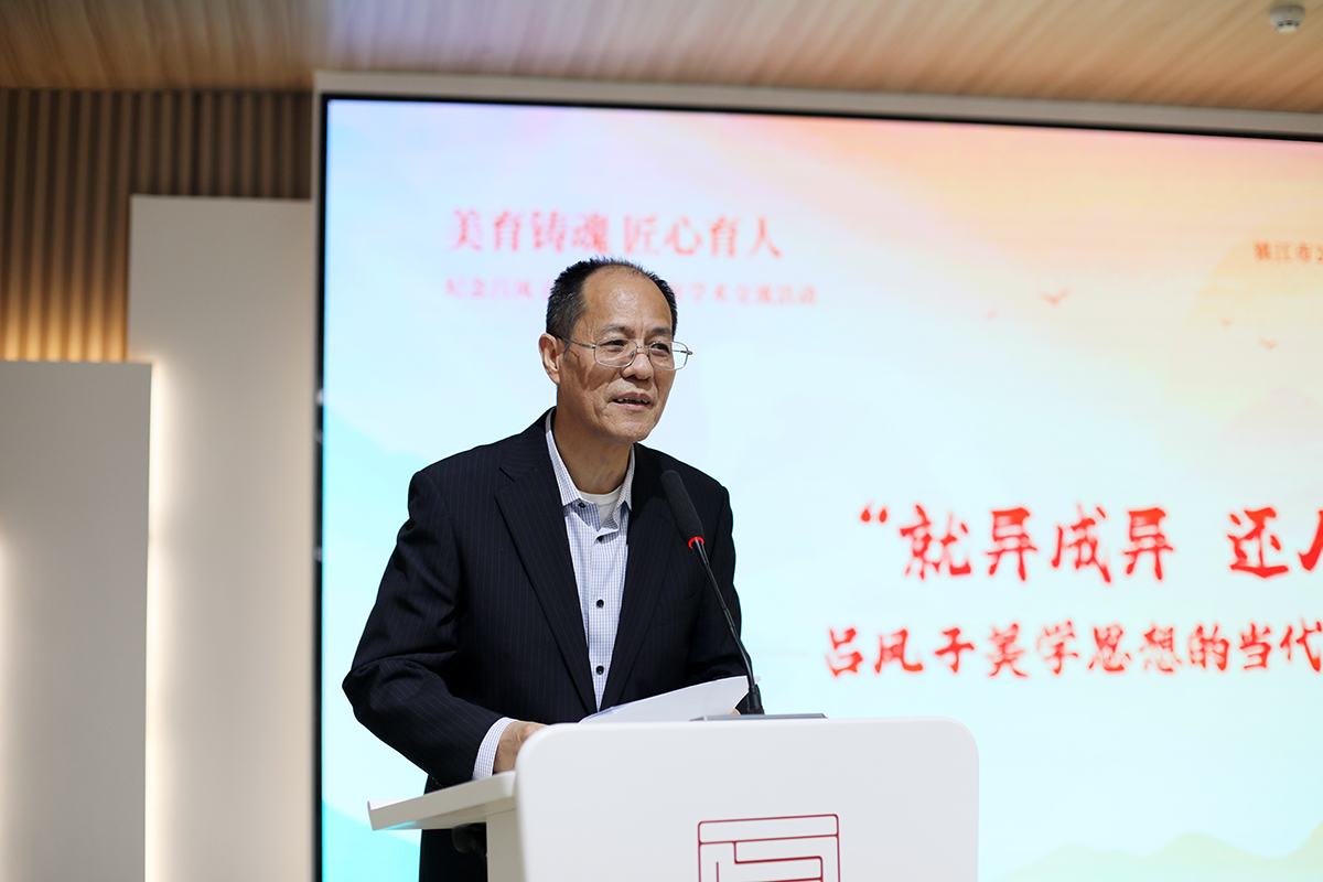 江苏省文史研究馆馆员、中国文艺评论家协会理事、一级美术师衡正安发言 活动邀请多位重量级嘉宾作主题发言。南京大学教授、江苏省书法家协会副主席、江苏省直书法家协会主席黄正明围绕书法艺术与美育实践发表见解;江苏省文史研究馆馆员、中国文艺评论家协会理事、一级美术师衡正安以“就异成异,还人为人”为题,深入阐释吕凤子美学思想的当代价值;新华日报社镇江分社高级记者余宽平、中国工艺美术大师吕存、金山职业技术学院党委书记徐铭、镇江市高等专科学校原艺术设计学院院长蒋纯利等也分别从不同角度分享了研究成果。