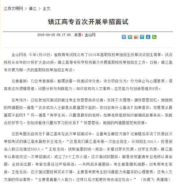 镇江日报|江苏文明网|镇江高专首次开展单招面试