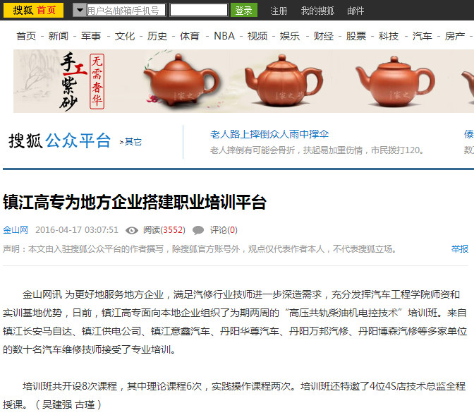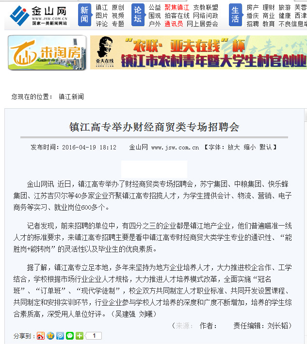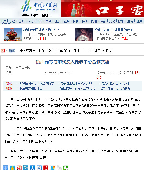 媒体链接: 镇江日报 http://www.jsw.com.cn/site3/zjrb/html/2016-04/19/content_3054726.htm 中国江苏网 http://jsnews.jschina.com.cn/system/2016/04/19/028412107.shtml