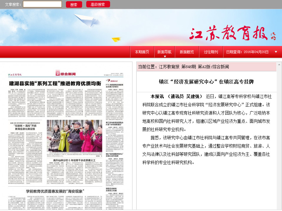 媒体链接: 江苏教育报 第646期 第A2版:综合新闻 http://221.226.41.82:9001/shtml/jsjyb/20160420/27250.shtml 本报讯 (通讯员 吴建强) 近日,镇江高等专科学校与镇江市社科院联合成立的镇江市社会科学院“经济发展研究中心”正式组建。该研究中心以镇江高专现有社科研