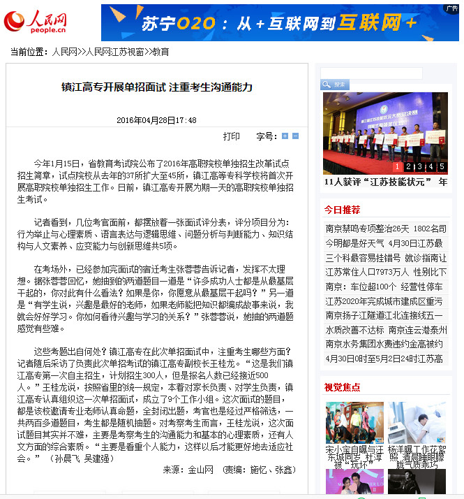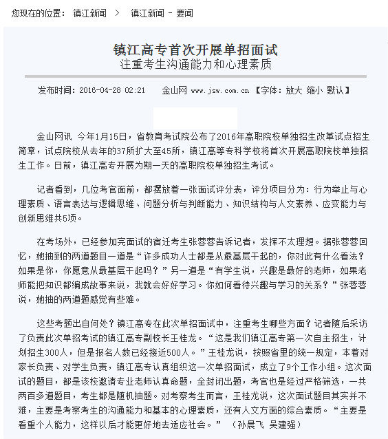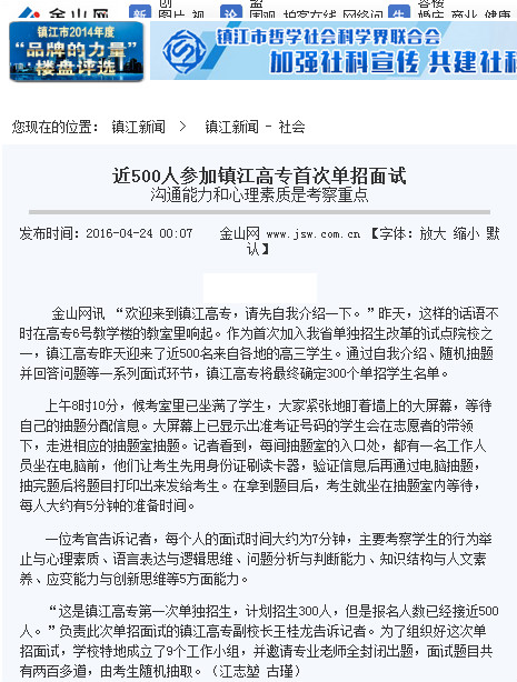 媒体链接: 镇江日报 http://www.jsw.com.cn/site3/zjrb/html/2016-04/28/content_3056362.htm 江苏文明网 http://wm.jschina.com.cn/9663/201604/t2789030.shtml 光明网 http://edu.gmw.cn/newspaper/2016-04/28/content_11209