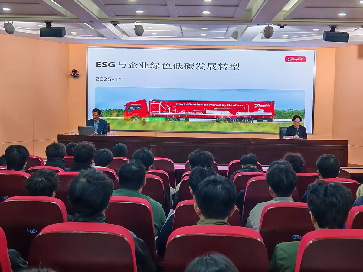 11月5日上午,全球领先的工程集团丹佛斯技术总监邱龙涛先生应邀为电气学院师生主讲了一场以“ESG与企业绿色低碳发展转型”为主题的专题讲座。讲座由电气与(交通)学院院长王琦主持,学院部分教师及学生参与了讲座。 讲座中,邱龙涛总监结合丹佛斯集团的全球实践,深入阐述了ESG(环境、社会及治理)理念如何成为驱动企业绿色转型的核心竞争力。他详细介绍了公司动力系统、气候方案及电力电子传动三大事业部如何通